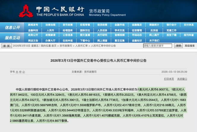中国人民银行授权中国外汇交易中心公布,2026年3月23日银行间外汇市场人民币汇率中间价为1美元对人民币6.9041元,1欧元对人民币7.9676元,100日元对人民币4.3320元,1港元对人民币0.88114元,1英镑对人民币9.1909元,1澳大利亚元对人民币4.8326元,1新西兰元对人民币4.0208元,1新加坡元对人民币5.3776元,1瑞士法郎对人民币8.7534元,1加拿大元对人民币5.0275元,人民币1元对1.1695澳门元,人民币1元对0.57056林吉特,人民币1元对12.0650俄罗斯卢布,人民币1元对2.4760南非兰特,人民币1元对218.32韩元,人民币1元对0.53286阿联酋迪拉姆,人民币1元对0.54469沙特里亚尔,人民币1元对49.3029匈牙利福林,人民币1元对0.53613波兰兹罗提,人民币1元对0.9374丹麦克朗,人民币1元对1.3550瑞典克朗,人民币1元对1.3886挪威克朗,人民币1元对6.42868土耳其里拉,人民币1元对2.6015墨西哥比索,人民币1元对4.7774泰铢。